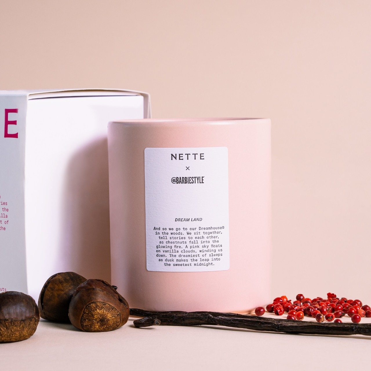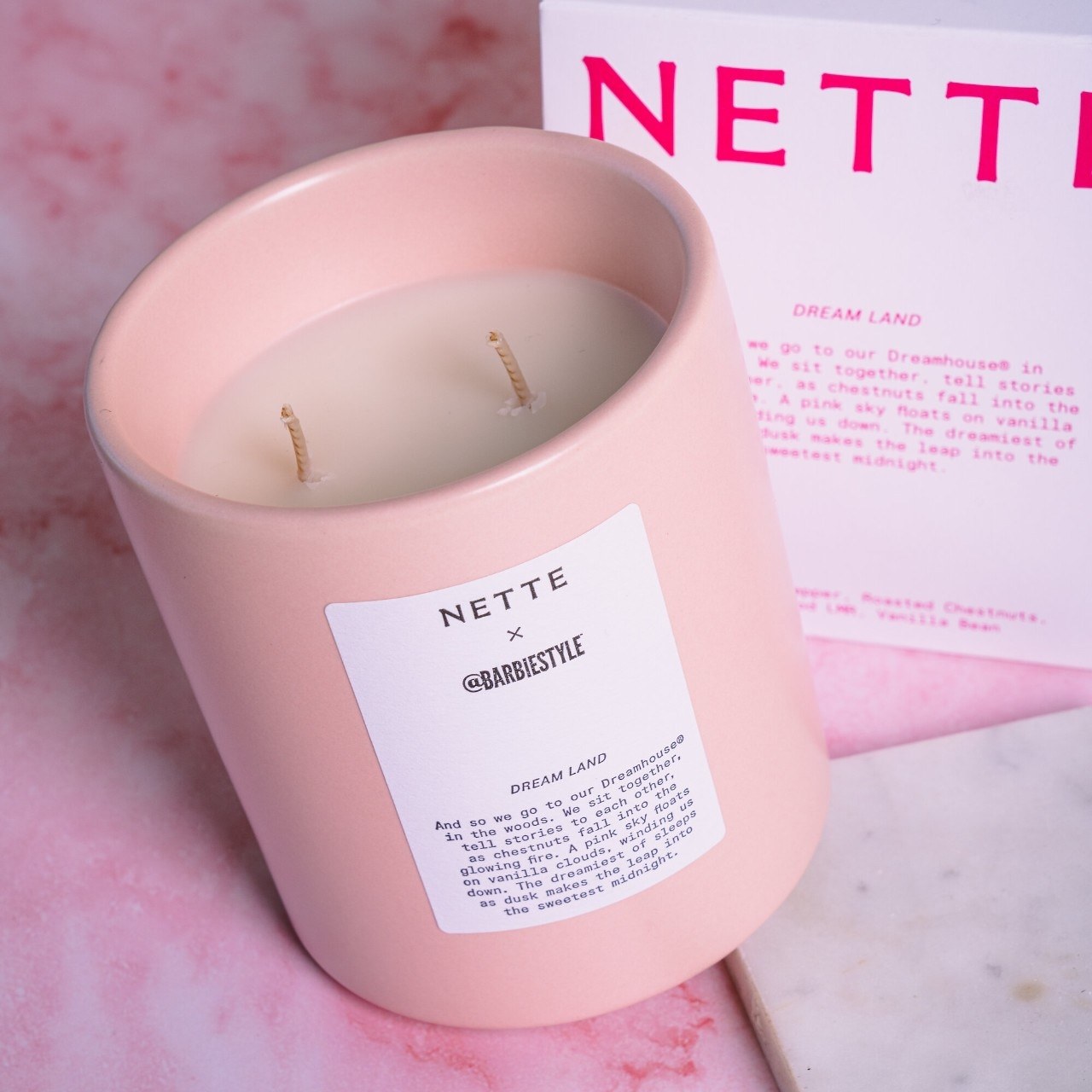 Fragrance Description: Dream Land—Nette's collab candle with @BarbieStyle™—is inspired by Barbie’s Dreamhouse®. It has notes of pink pepper, roasted chestnut, leatherwood LMR, and vanilla bean that make for an absolute confection of a scent. Sophisticated and fun, just like @barbiestyle herself!
